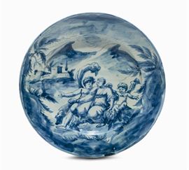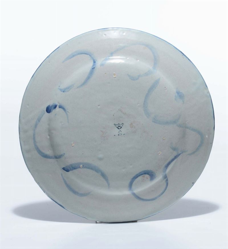 Piatto in maiolica bianca e blu decorato con figure, Savona, marca corona, XVIII secolo