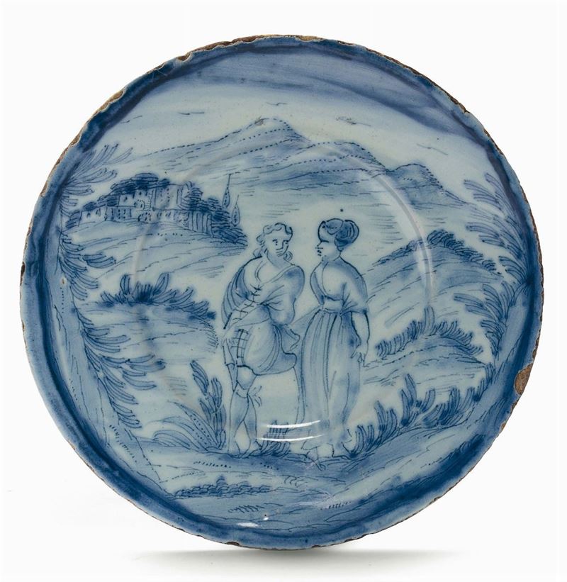 Piatto in maiolica decorato “a scenografia barocca”, Savona XVIII secolo