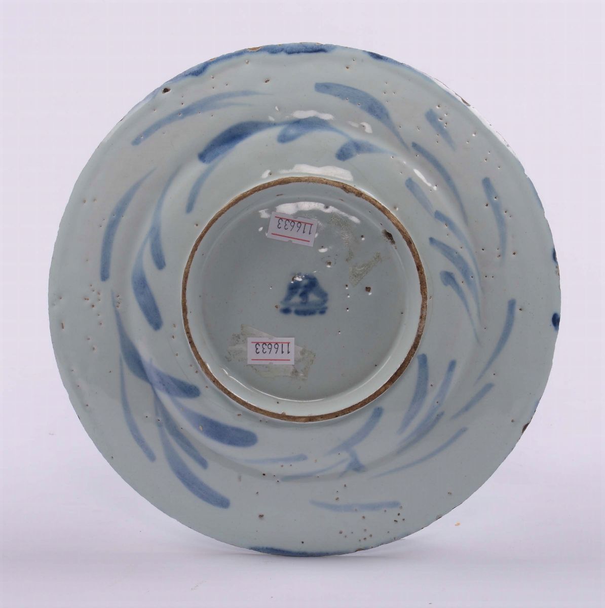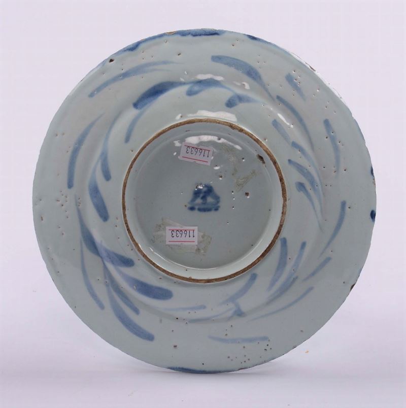 decoro in monocromia blu e azzurro raffigurante figure entro paesaggio con architetture, piede ad anello, marca Stemma, diametro cm 23 (sbeccature)
