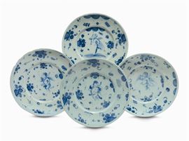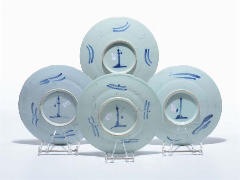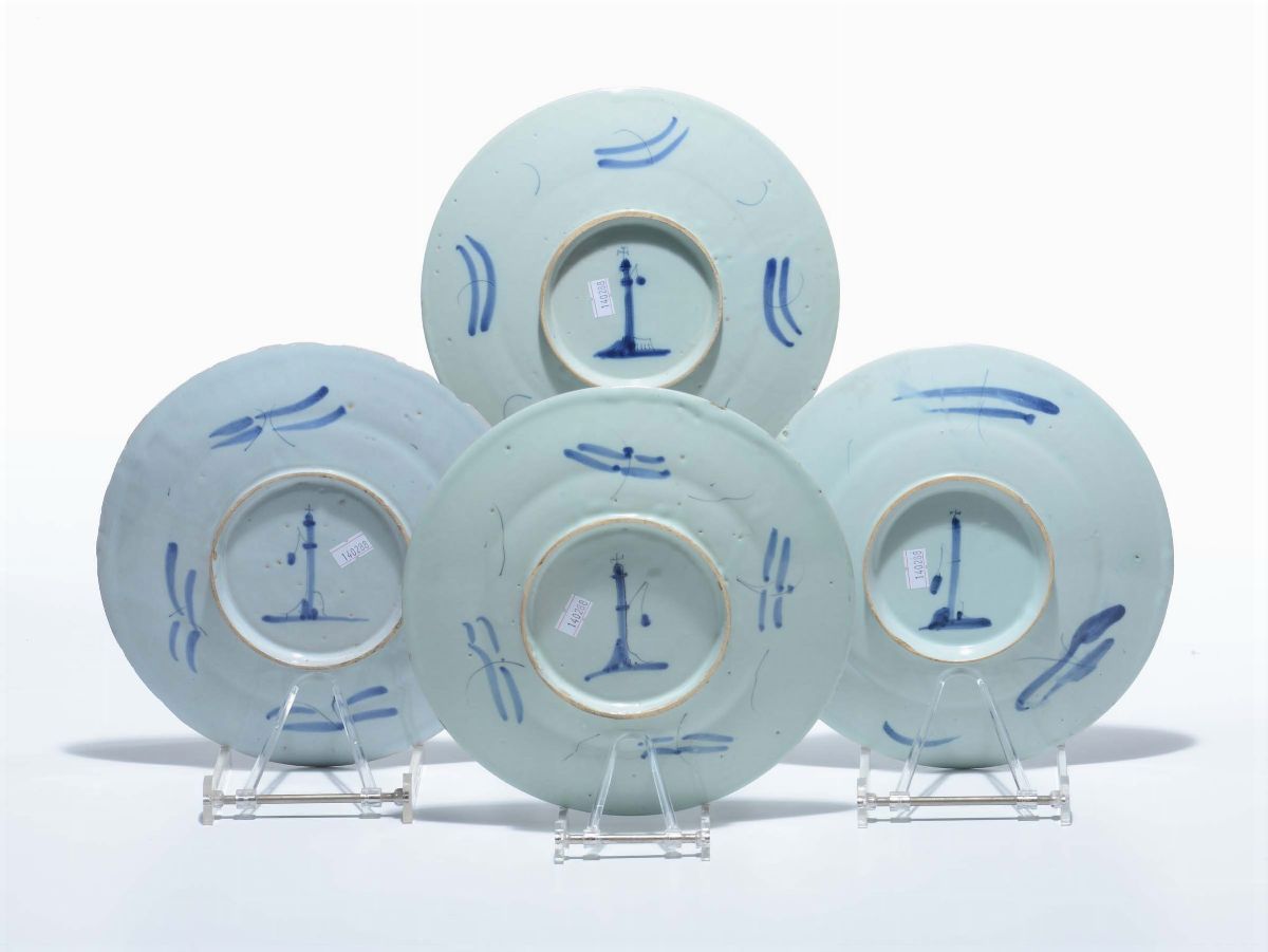 Quattro piatti in maiolica, Savona, marca Lanterna, XVIII secolo
