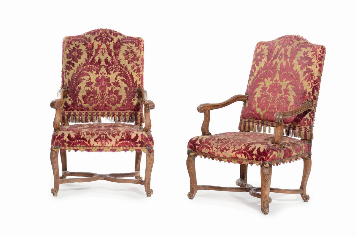 Quattro poltrone Luigi XIV ad osso di montone in legno di noce, Genova prima metà XVIII secolo