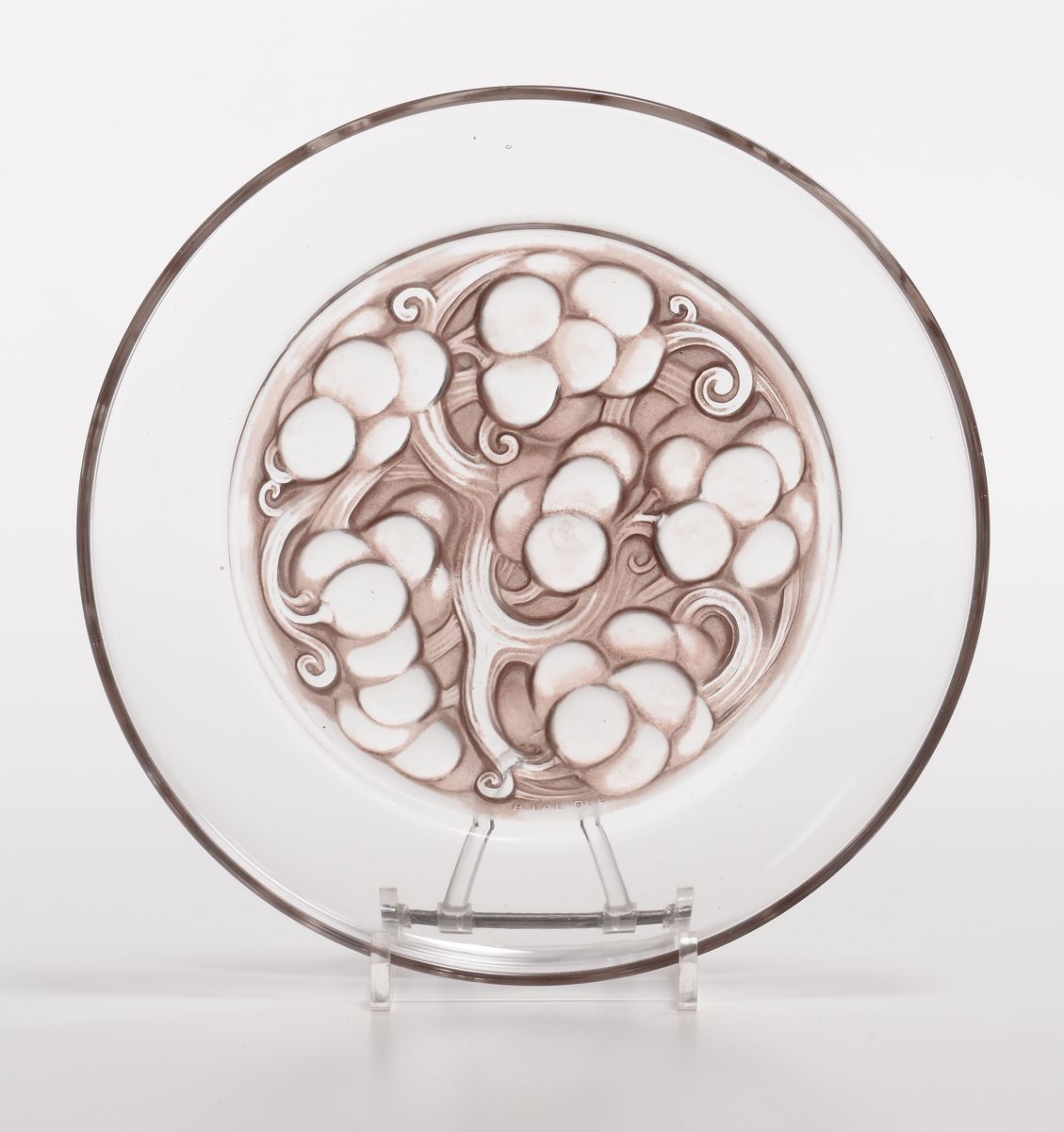 Piatto da dessert in vetro parzialmente opalescente patinato in viola. Firma in rilievo R. Lalique. Diametro cm 22. Modello creato nel 1927