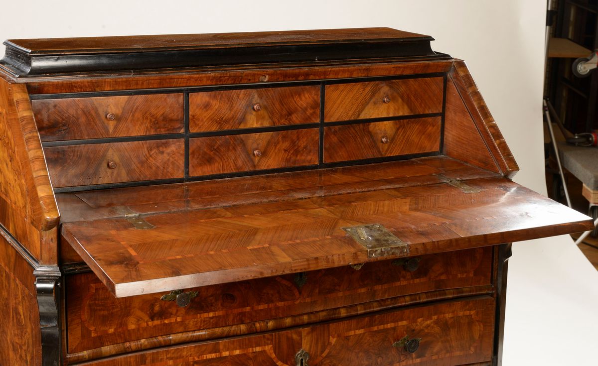 Ribalta lastronata in radica di noce e legno ebanizzato, Lombardia XVIII secolo
