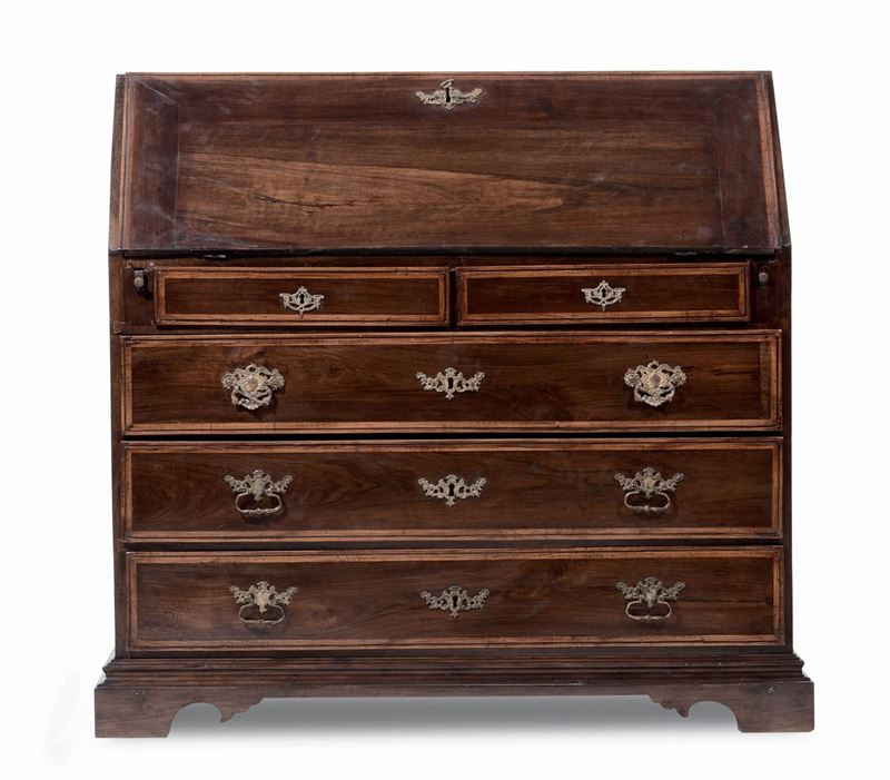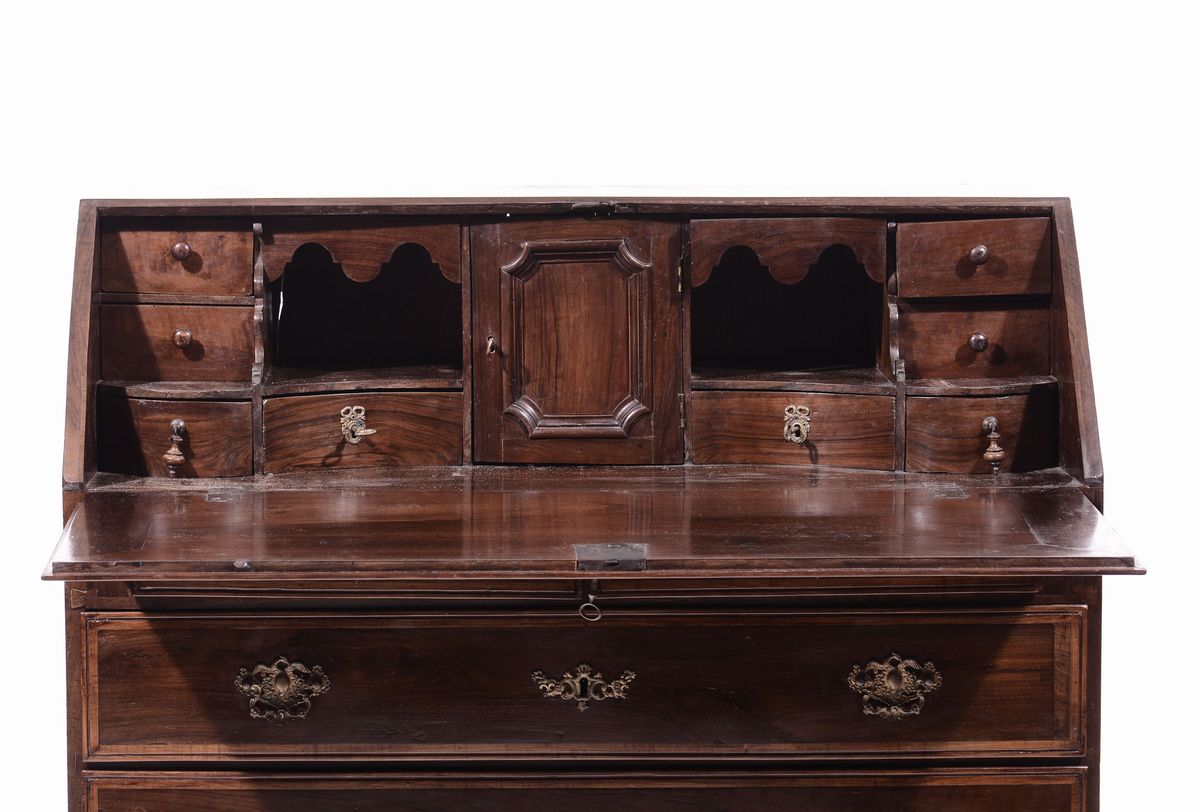 base a tre cassetti più due affiancati sotto la calatoia che cela cassettini e vani a giorno, cm 121x60x119
