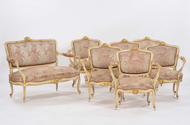 Salotto in legno intagliato, laccato e dorato, XIX-XX secolo