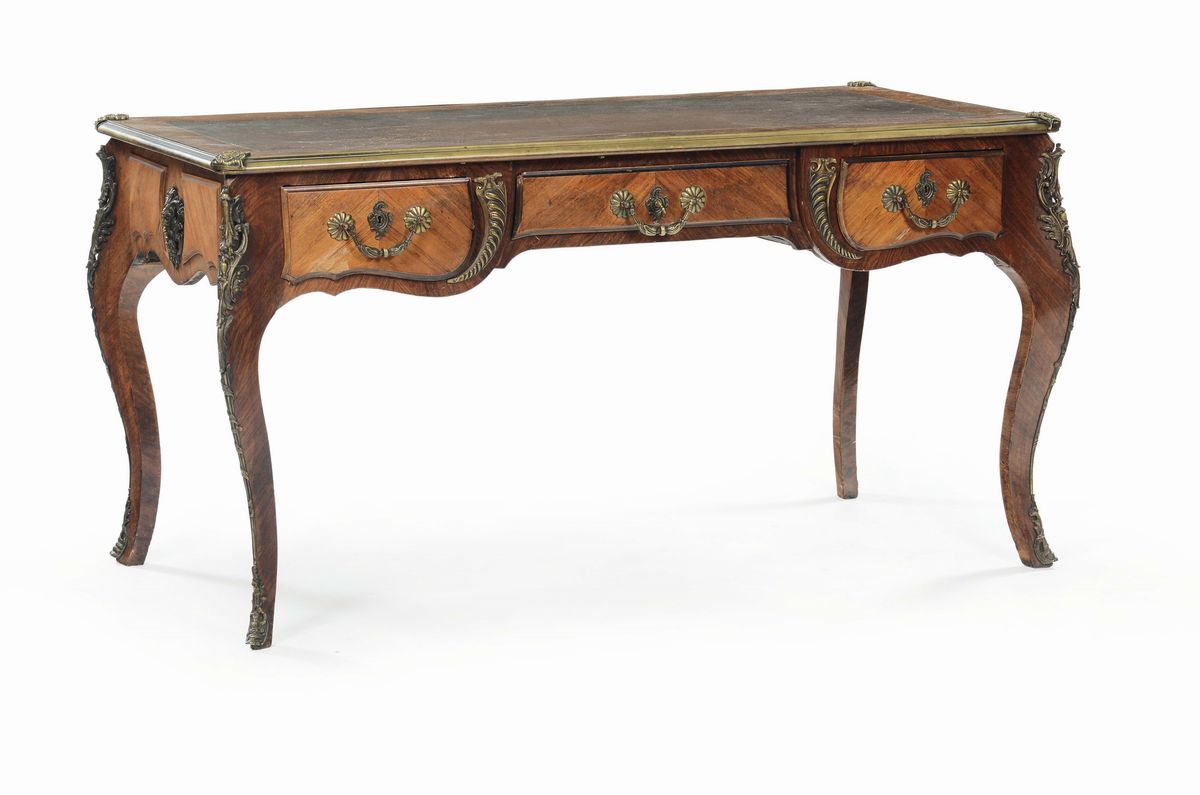 tre cassetti sulla fascia, applicazioni di bronzi dorati, gambe arcuate, cm 153x78x78
