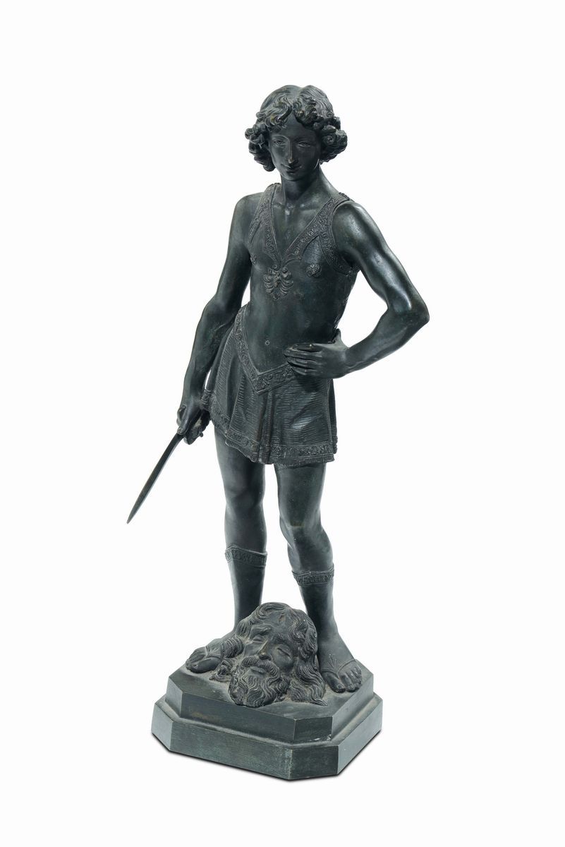 Scultura in bronzo patinato raffigurante “Davide con la testa di Golia”, XIX secolo