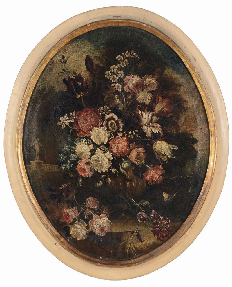 coppia di dipinti ad olio su tela ovale, cm 73x56
