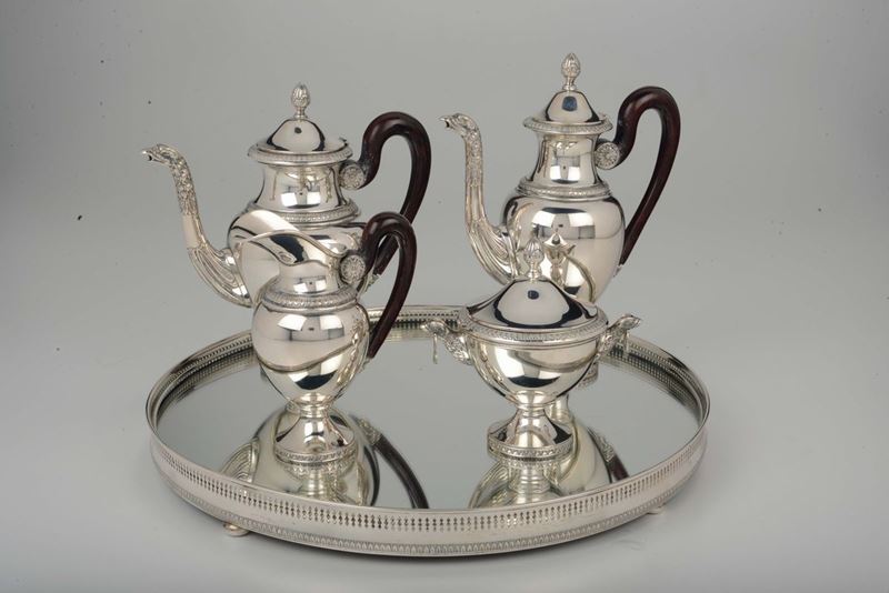 composto da vassoio a specchio, caffettiera, teiera, lattiera e zuccheriera
