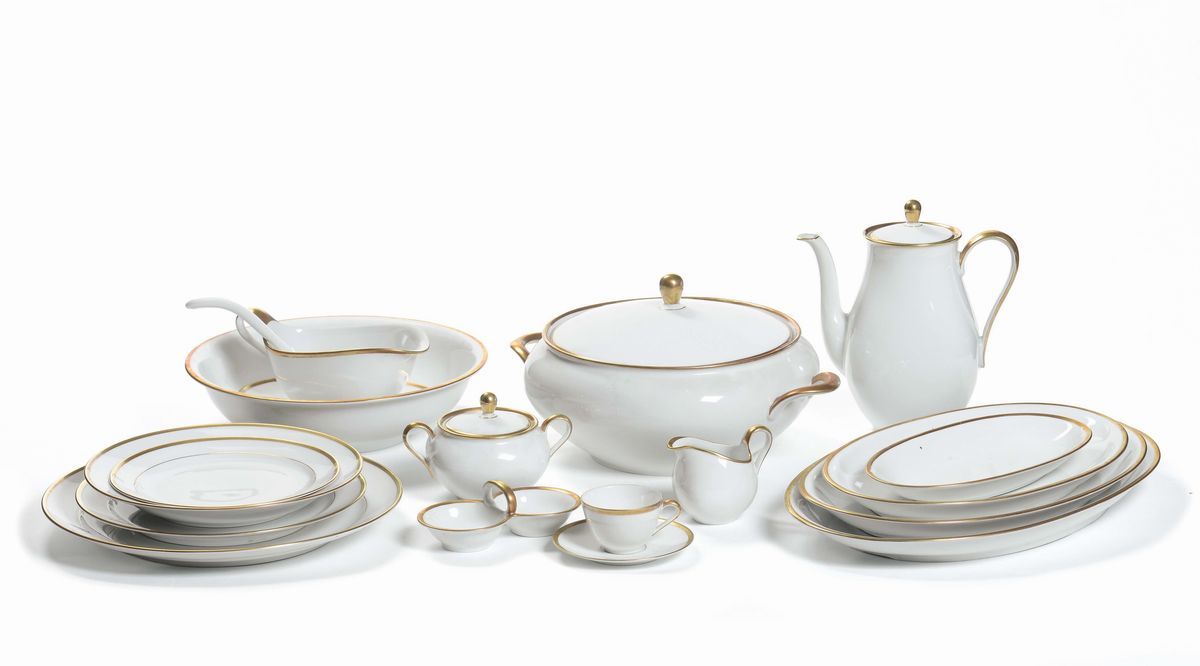 Servizio di piatti in porcellana a decoro bianco e oro