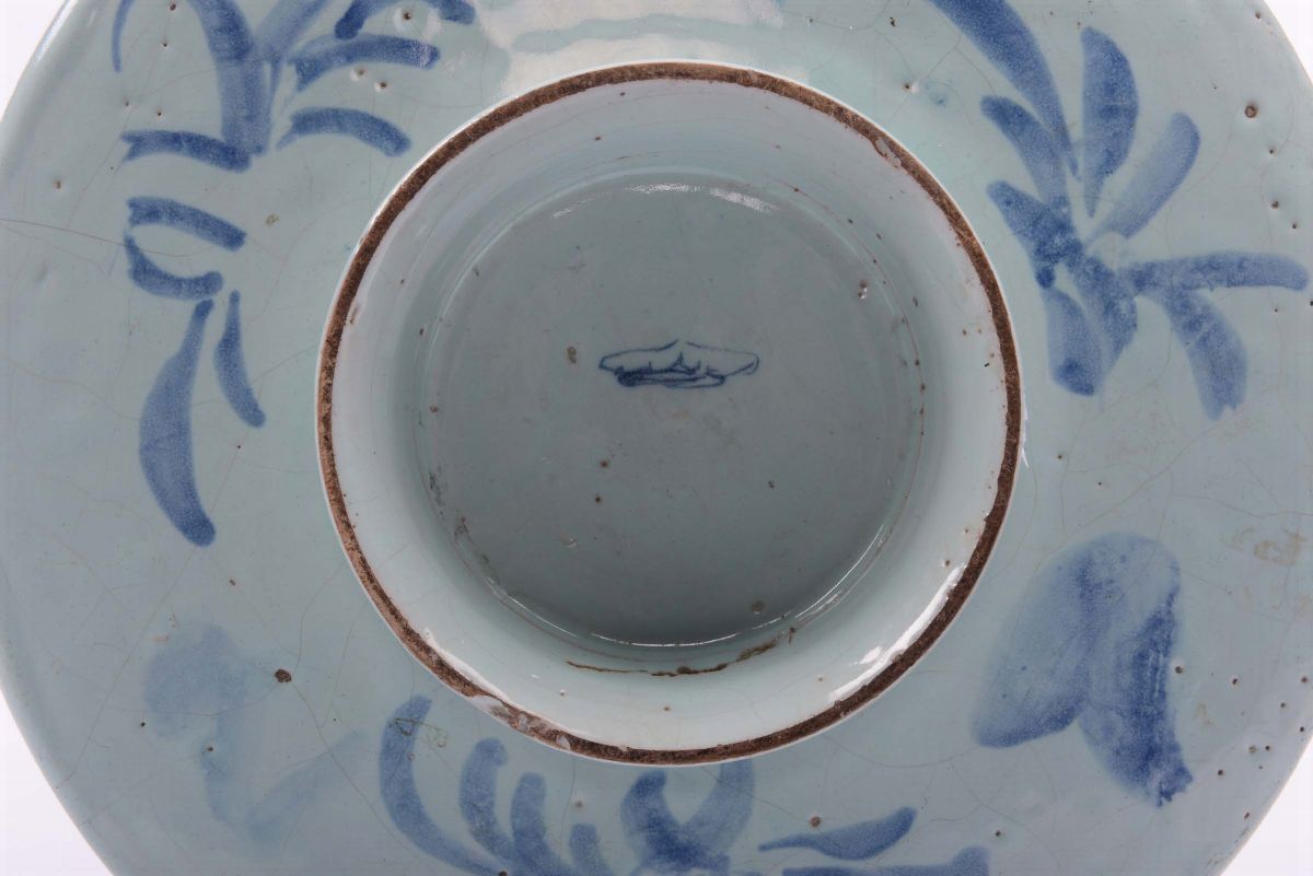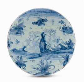 il piano di posa della sottocoppa ha la superficie lievemente concava; decoro nei toni del blu su fondo celadon raffigurante putti, elementi vegetali e floreali, marca tocco, diametro cm 29,5 (difetti)