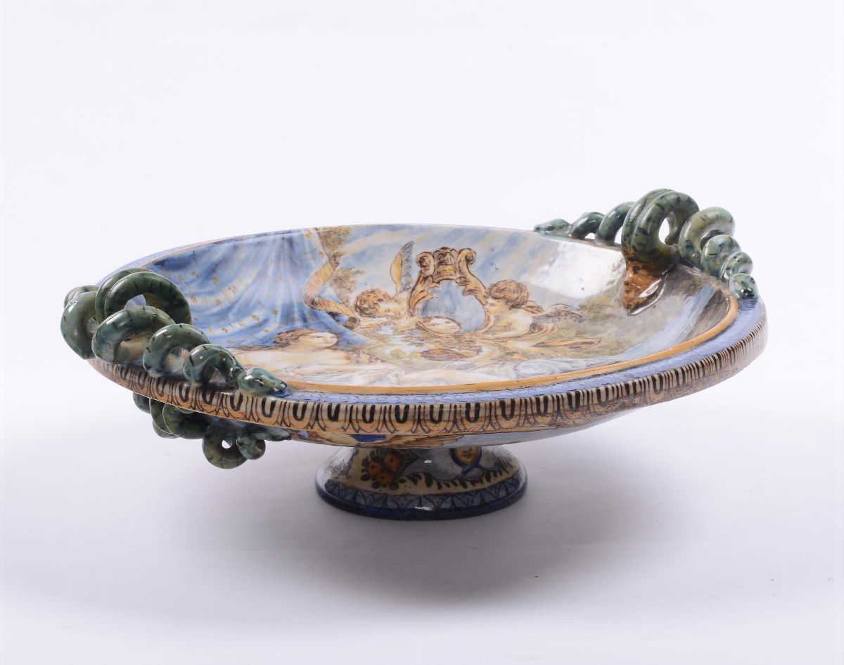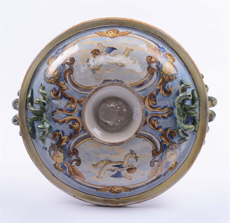 Sottocoppa in maiolica dipinta in policromia con putti e figure femminili, Castelli XIX secolo