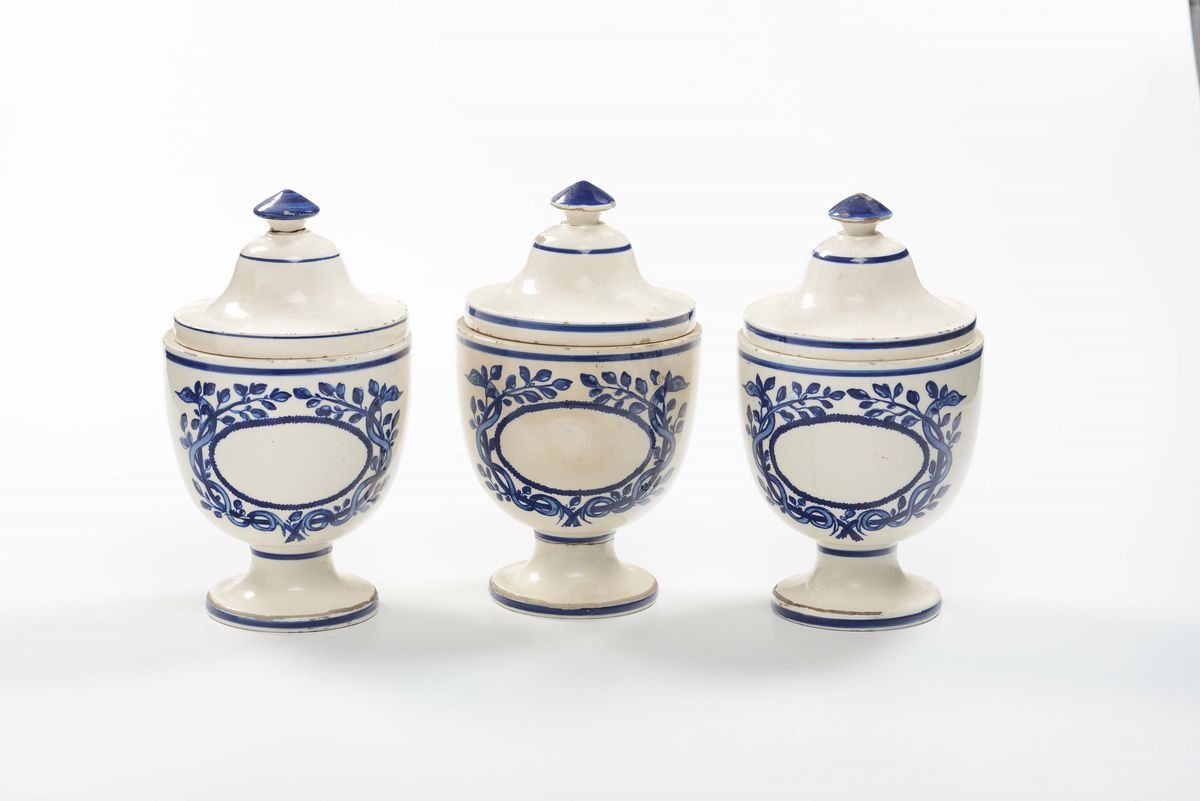 Tre vasi da farmacia in terraglia smaltata, fine XIX secolo