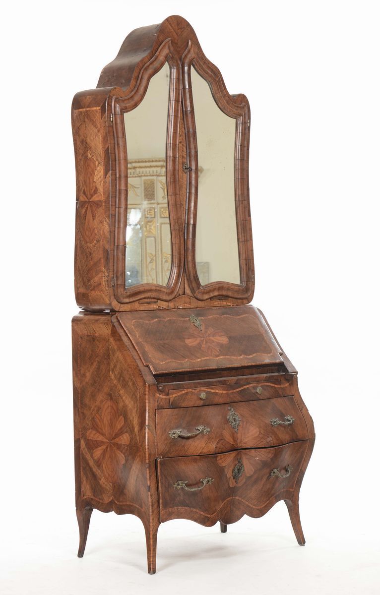 base con fronte mosso a due cassetti più due cassettini sotto la calatoia che cela cinque cassettini e vani portadocumenti, alzata a due ante a specchio celanti antina centrale, cassettini e vani a giorno, cm 101x54x237