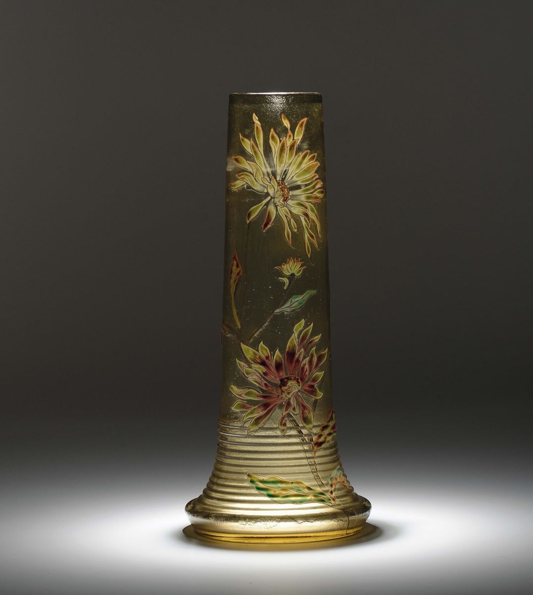 Grande vaso di forma cilindrica allargata alla base in vetro trasparente fumé. Decoro di crisantemi dipinto a smalti policromi e oro. Firma alla giapponese nel corpo.Altezza cm 42,5. 1880-1890. Difetti