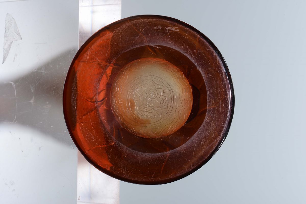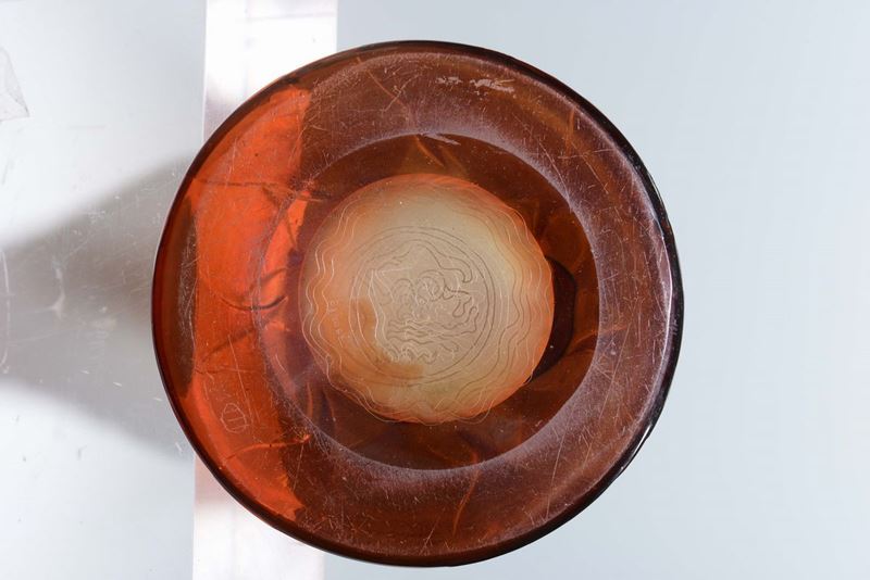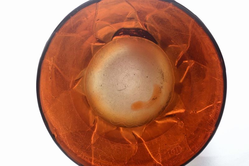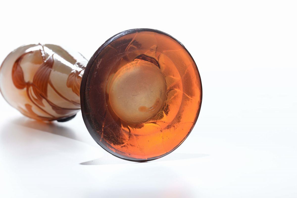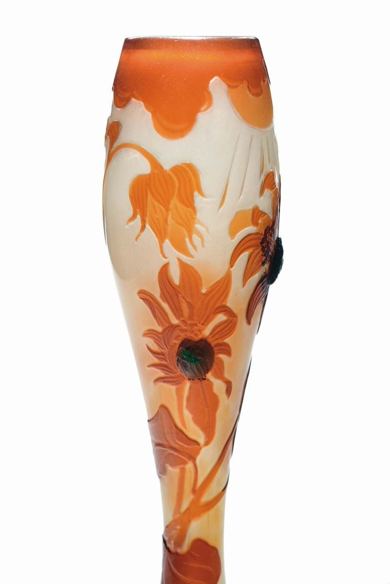 Vaso a balaustro in vetro lattimo doppiato in vetro ocra; lavorazione a cammeo alla ruota con raffinato decoro floreale e applicazione a caldo di cabochons. Elaborata firma incisa sotto la base. Altezza cm 34. 1880 circa