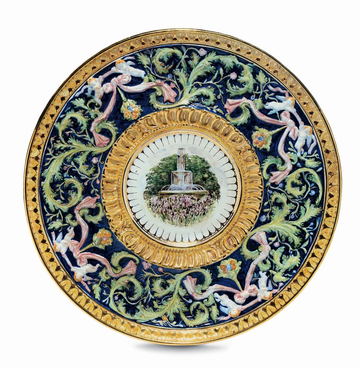Grande piatto da parata in terracotta maiolicata. Il cavetto è dipinto con fontana e aiuola di iris, mentre la tesa ha un decoro oreale con putti in rilievo. Sul retro marchio della manifattura Chini & Co. Mugello (Italia). Diametro cm 50. 1921-1928