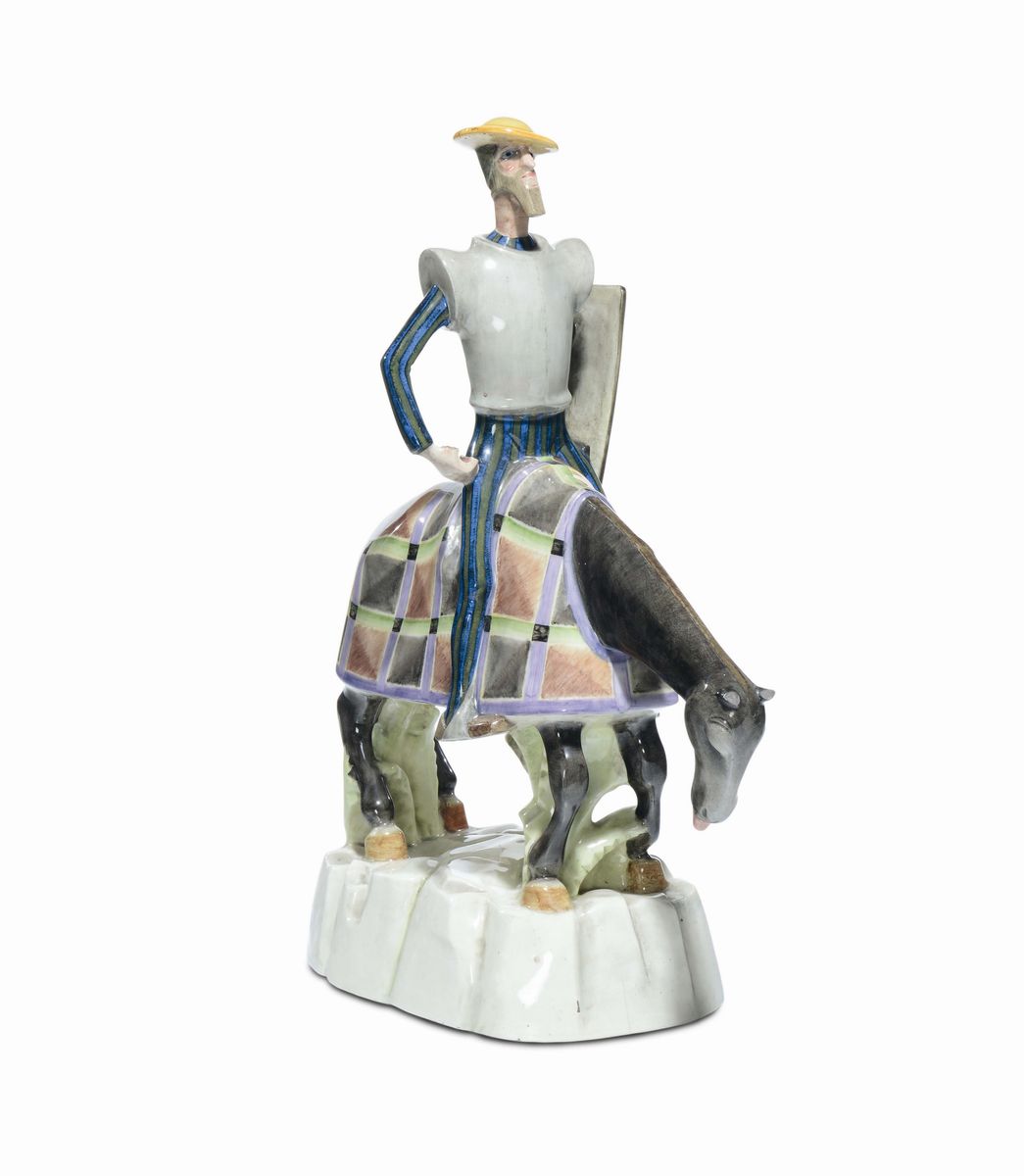 Statua in terraglia modellata a colaggio e decorata con smalti policromi sotto vernice. Firma dell’autore sulla base. Nell’incavo della base: Lenci made in Italy 25-8-30 N. Altezza cm 57. Difetti