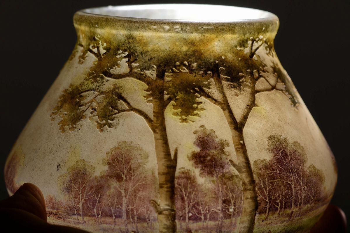 Piccolo vaso in vetro multistrato con decorazione di paesaggio autunnale ottenuto tramite acidatura e pittura a smalti policromi. Firma a smalto nel decoro. Altezza cm 15.1900 circa. Lievissima imperfezione