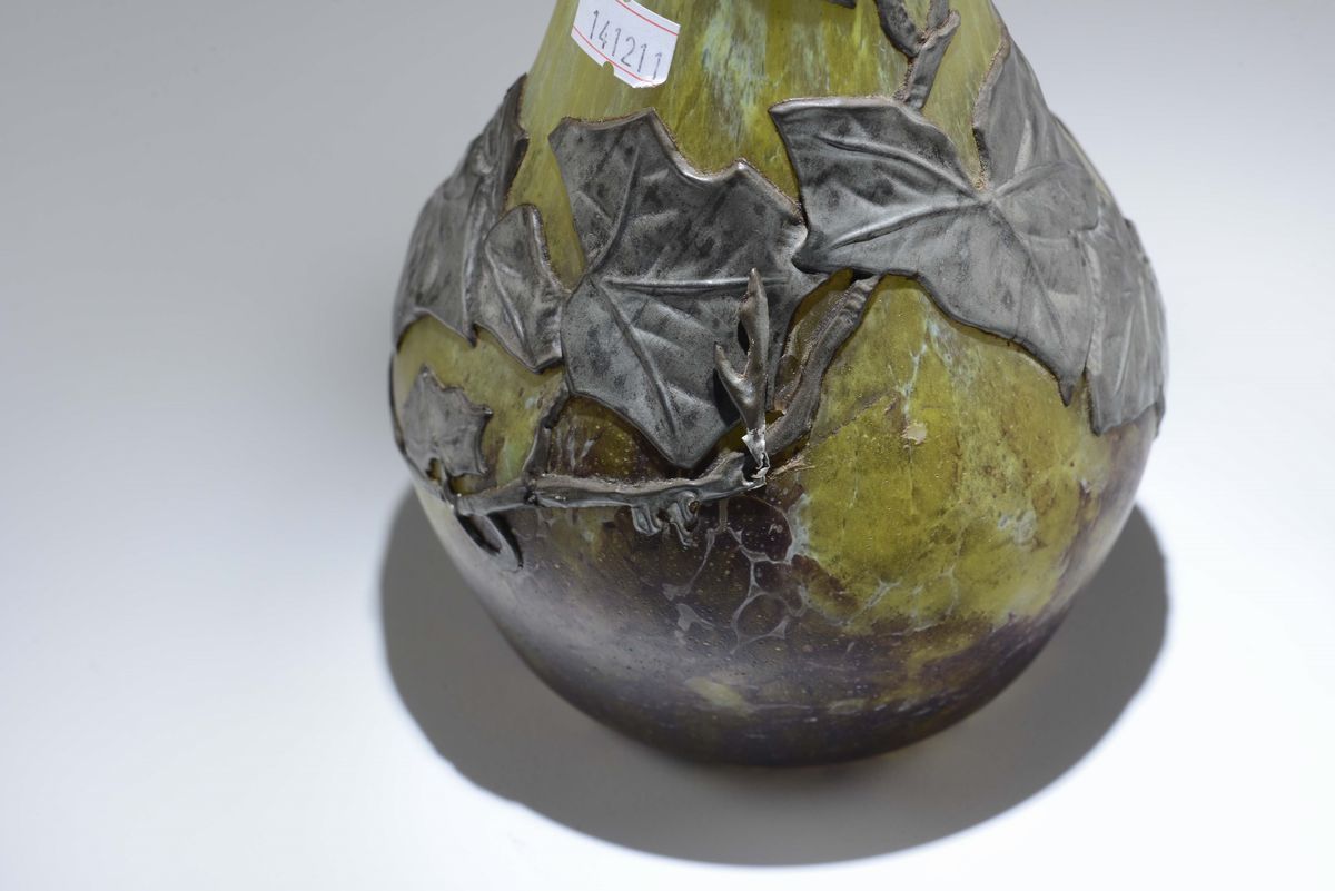 Grande vaso a bulbo con collo lungo e stretto. Vetro marmorizzato verde e marrone con applicata decorazione in metallo raf gurante edera. Firma all’acido Daum Nancy e croce di Lorena. Altezza cm 58. 1920 circa. Filatura