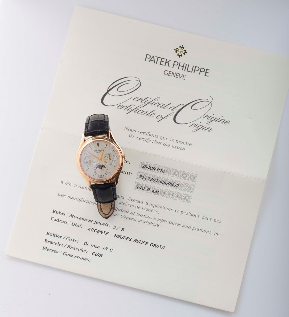 PATEK PHILIPPE, Ref.3940,movimento No. 3127291, case No. 4260932, orologio da polso in oro rosa 18K, automatico,con fasi lunari e calendario perpetuo, indicazione delle 24 ore, con chiusura deployante in oro rosa 18K. Venduto nel Gennaio del 2005. Accompagnato da Certificato di Origine, fondello aggiuntivo e correttore.