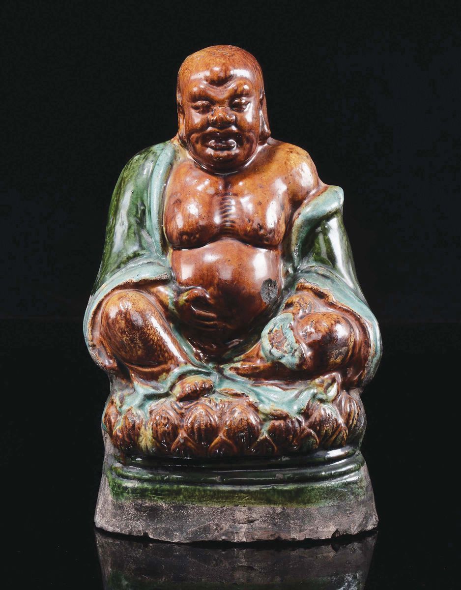 Budai in grès smaltato su fiore di loto, Cina, Dinastia Ming, XVII secolo