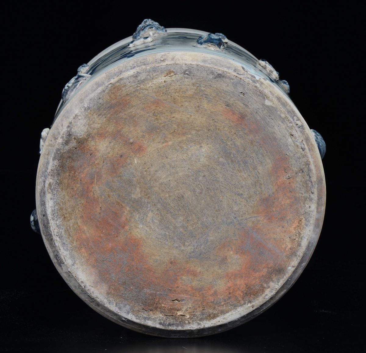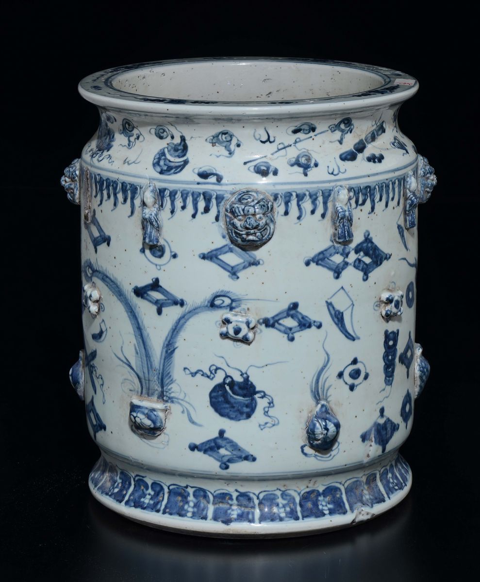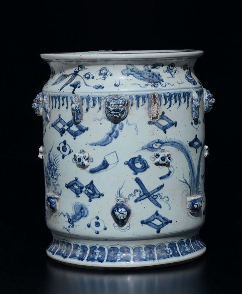 Cachepot in porcellana bianca e blu con decoro naturalistico a rilievo, Cina, XX secolo