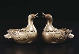 Coppia di incensieri in bronzo dorato a forma di anatre, Cina, Dinastia Qing, XIX secolo