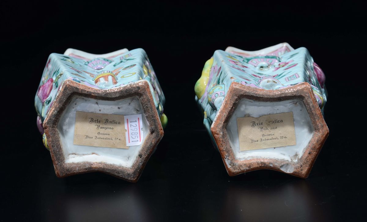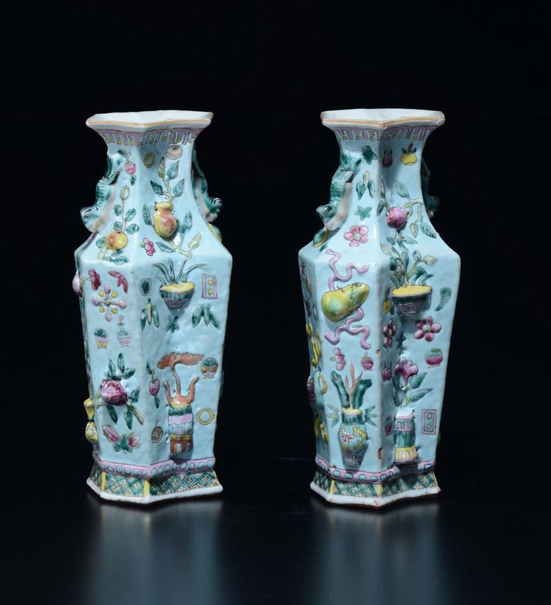 Coppia di piccoli vasi a base esagonale in porcellana a fondo turchese con frutti a rilievo, Cina, Dinastia Qing, XIX sec [..]