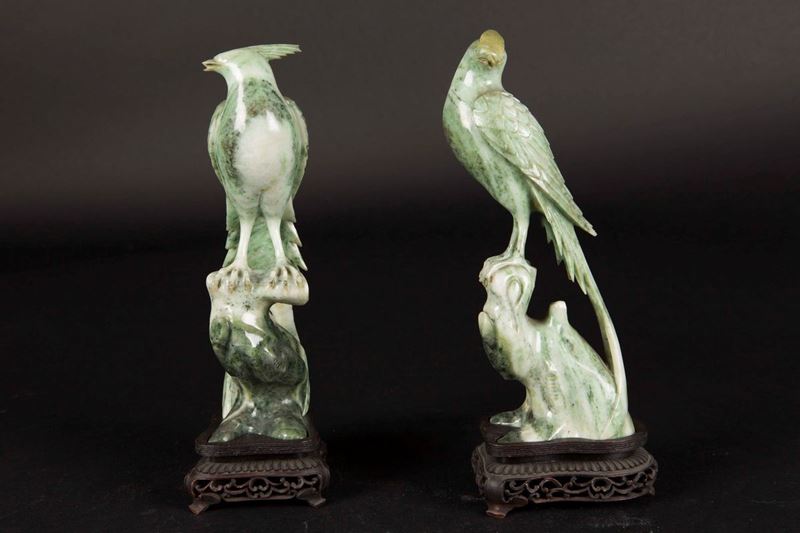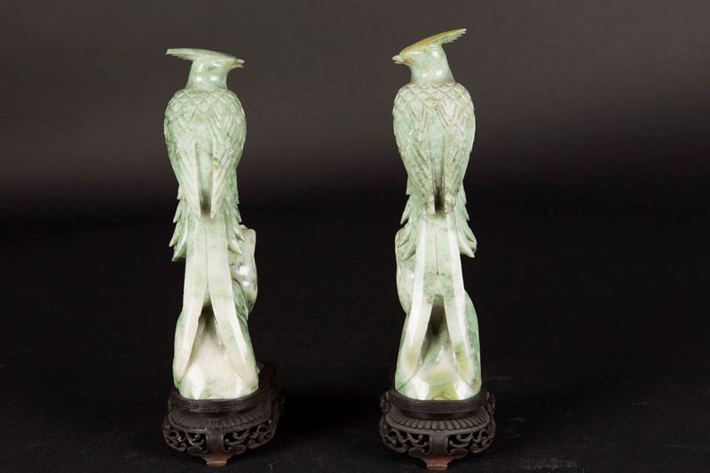 Coppia di uccellini scopliti in giadeite verde, Cina, XX secolo