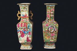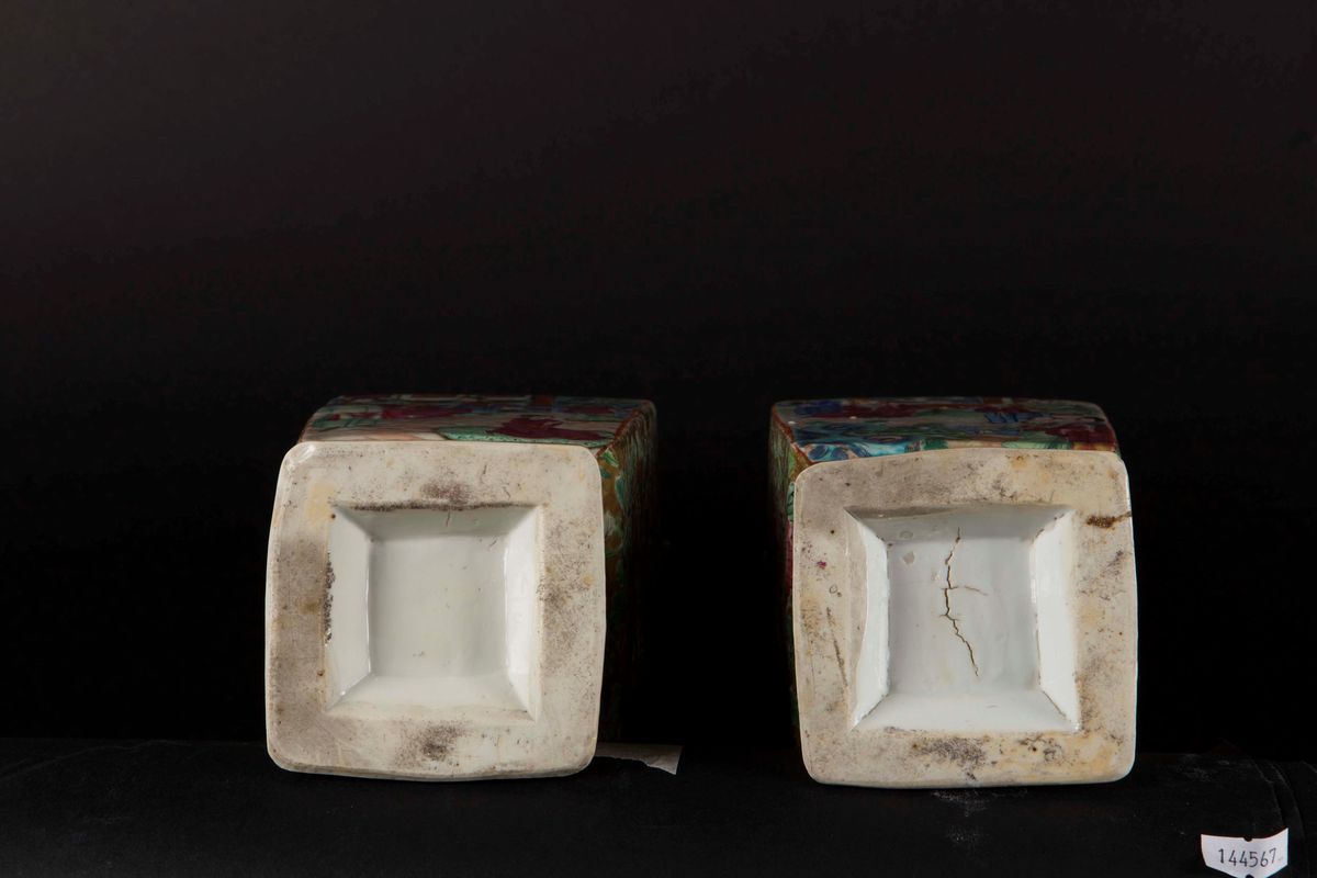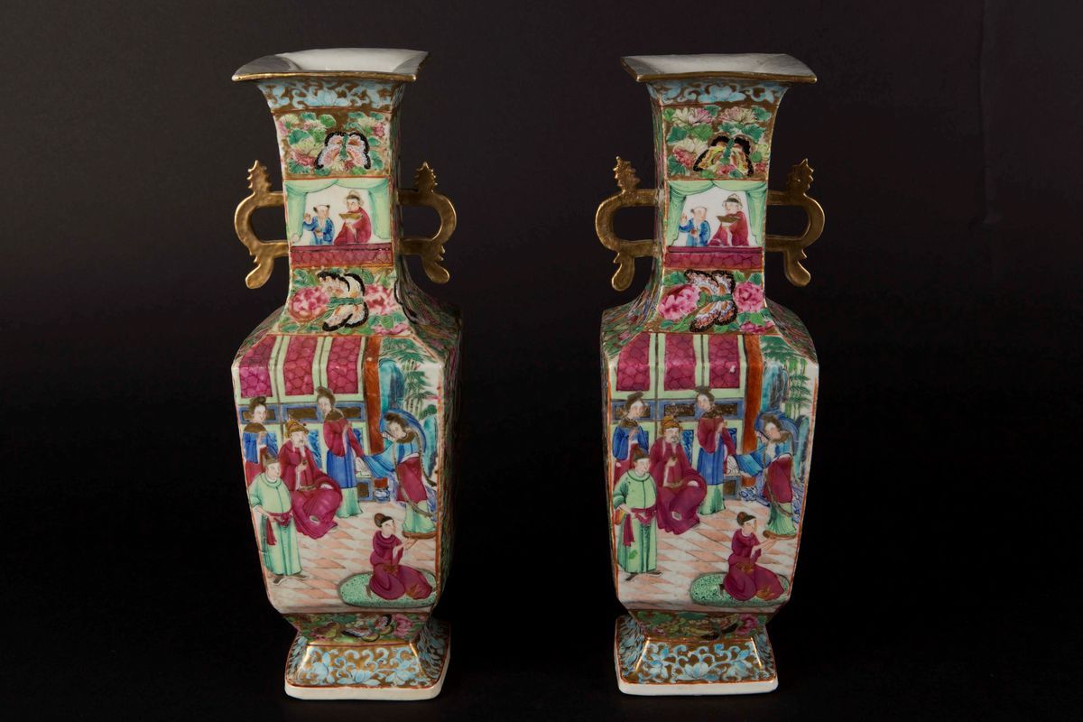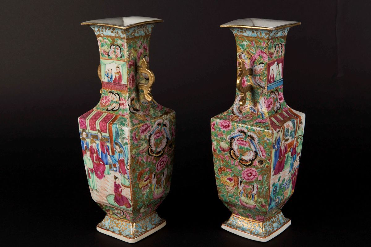 Coppia di vasetti in porcellana a smalti policromi con scene di vita di corte a doppia ansa, Cina, Dinastia Qing, XIX secolo