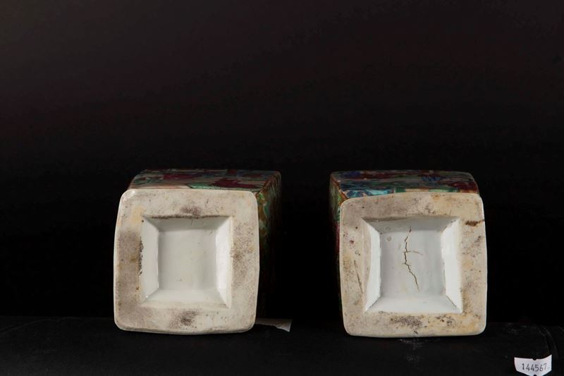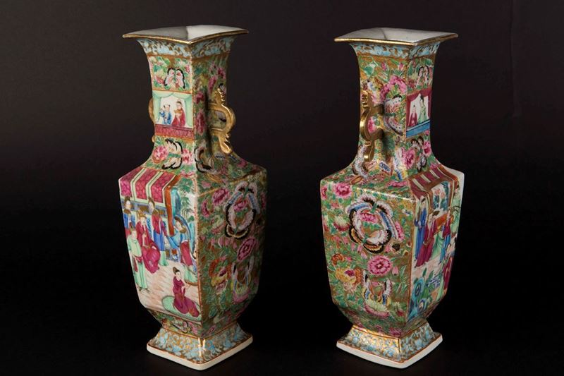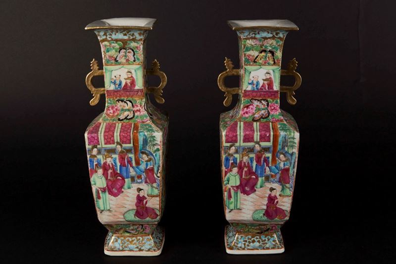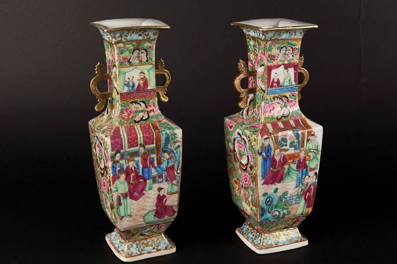 Coppia di vasetti in porcellana a smalti policromi con scene di vita di corte a doppia ansa, Cina, Dinastia Qing, XIX sec [..]