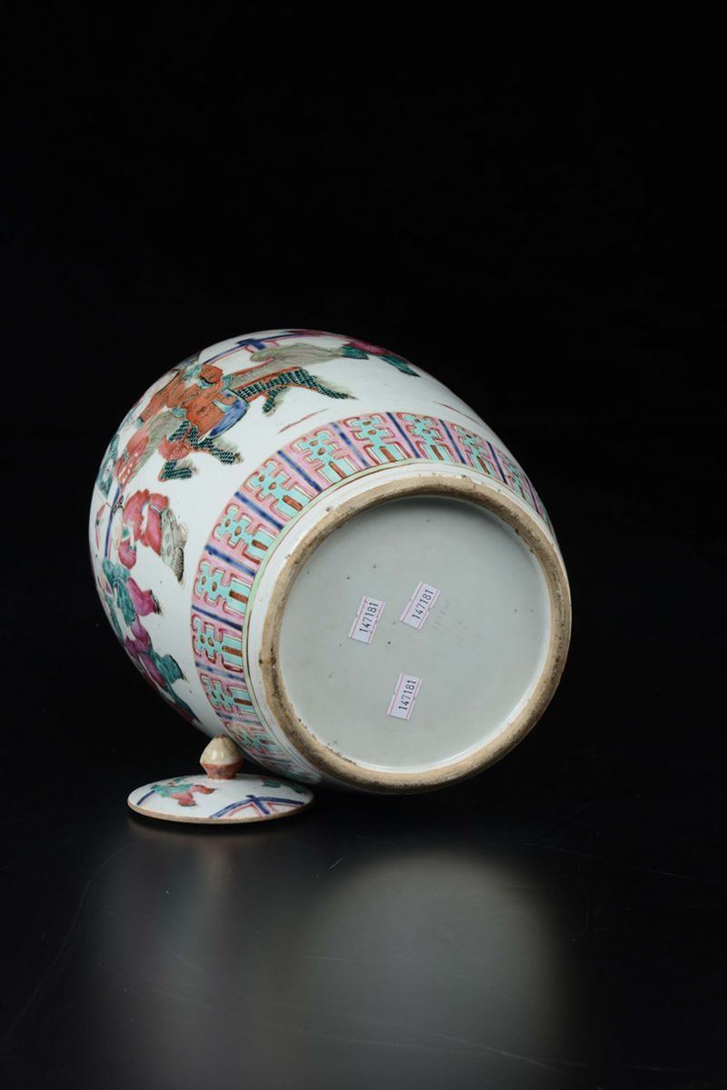 Coppia di vasi con coperchio in porcellana a smalti policromi raffiguranti scene di celebrazoni, Cina, Dinastia Qing, XIX [..]