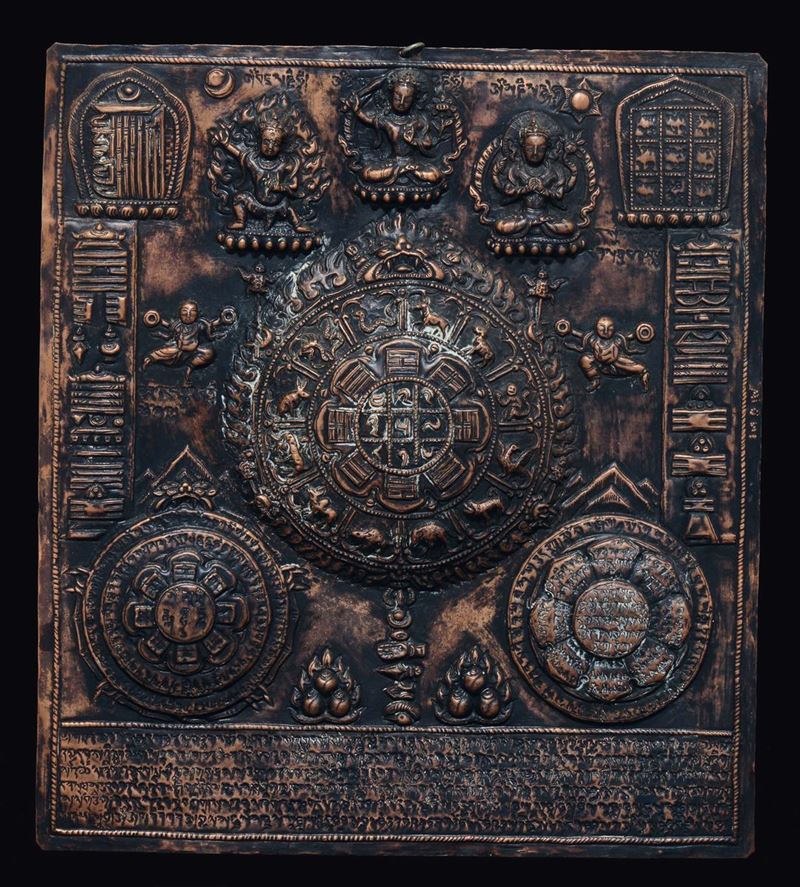 Due placche in rame sbalzato raffiguranti divinità e ruota con segni zodiacali, Tibet, XIX secolo