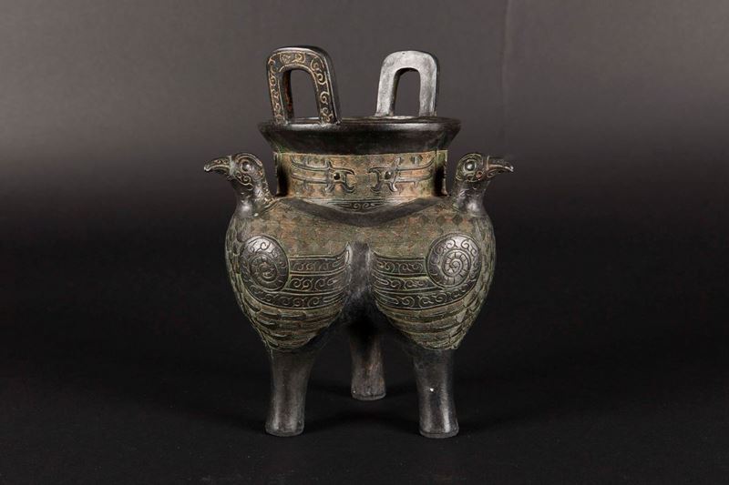 Incensiere tripode in bronzo con decoro a motivo arcaico, Cina, XX secolo