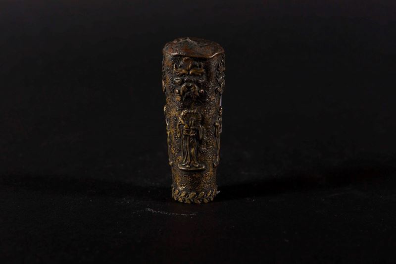 Piccolo manico portaventaglio in metallo con decoro dorato raffigurante Guanyin, Cina, Dinastia Qing, XVIII secolo