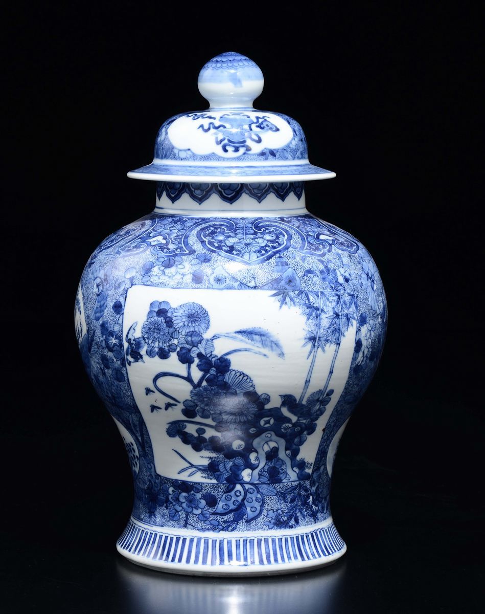 Potiche con coperchio in porcellana bianca e blu con decoro naturalistico entro riserve, Cina, Dinastia Qing, epoca Guangxu [..]