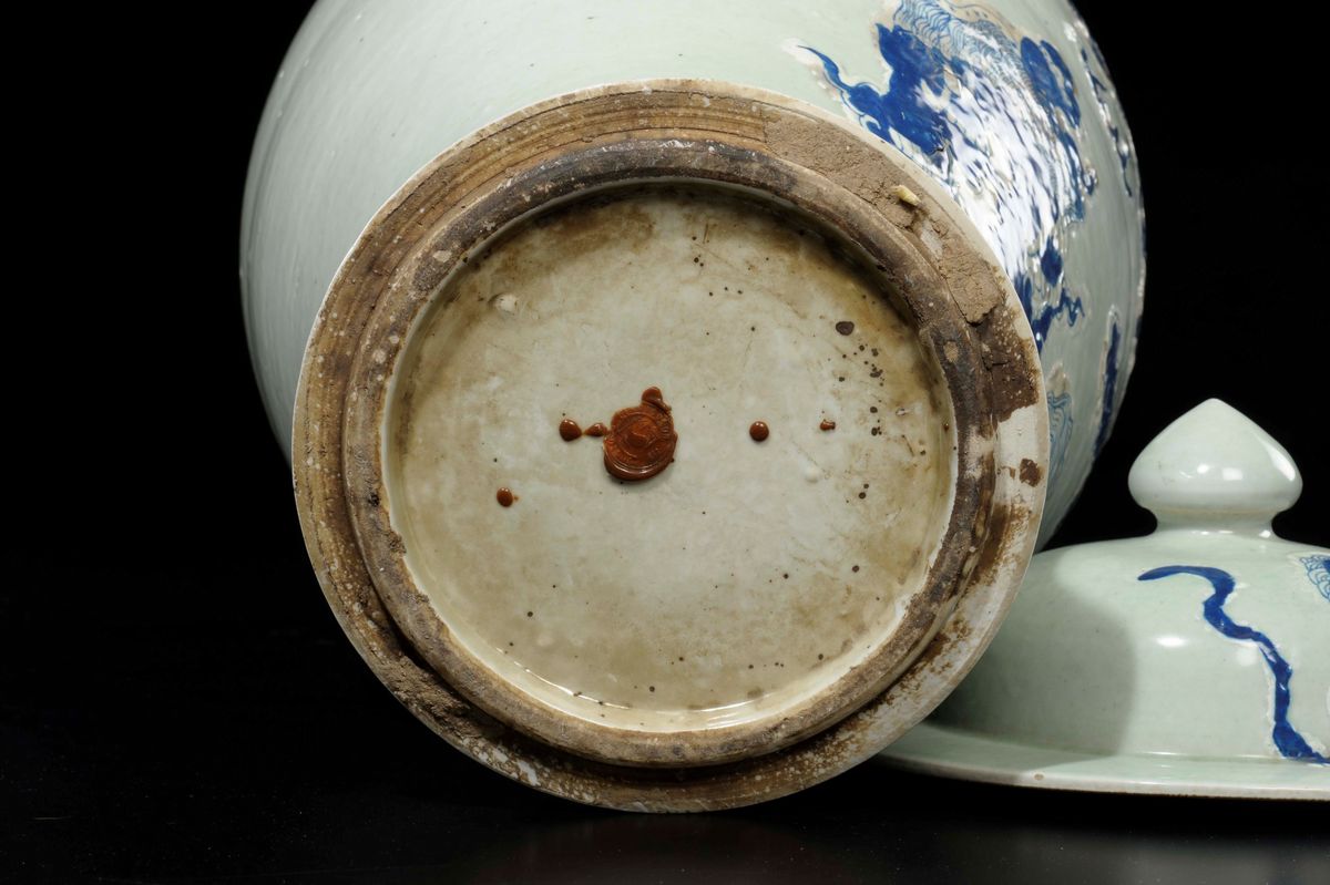 Potiche con coperchio in porcellana Celadon con cani di Pho bianchi e blu, Cina, inizio XX secolo