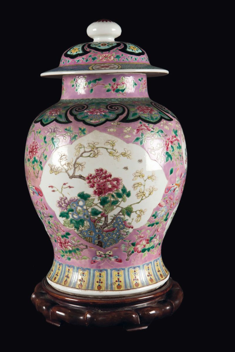 Potiche con coperchio in porcellana Famiglia Rosa con decoro floreale entro riserve, Cina, Dinastia Qing, XIX secolo
