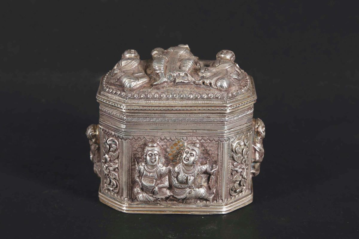 Scatola con coperchio in argento con personaggi a rilievo, Birmania, XIX secolo