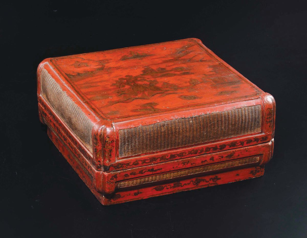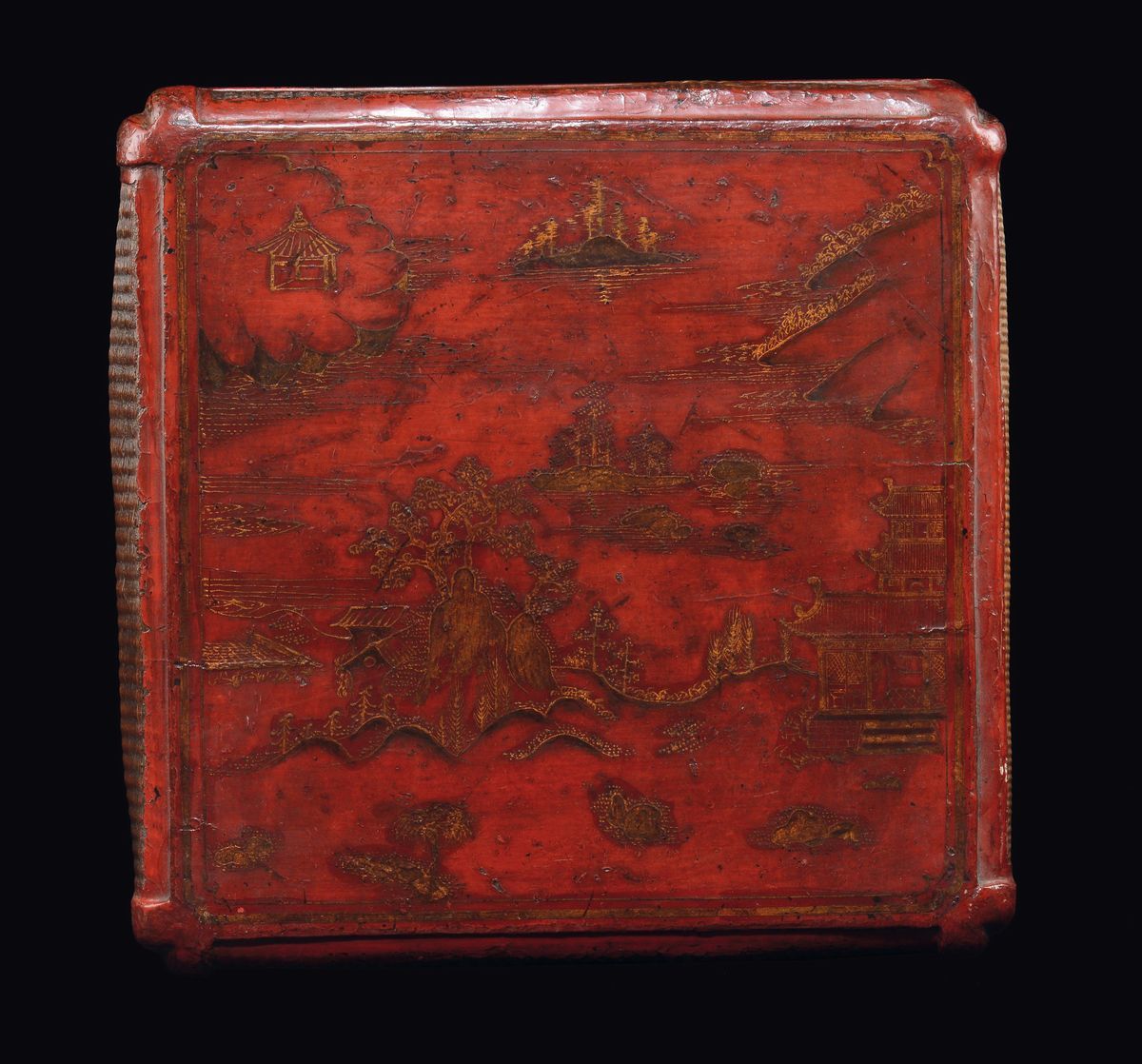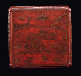 Scatola con coperchio in lacca rossa raffigurante villaggio su un fiume, Cina, Dinastia Qing, XIX secolo