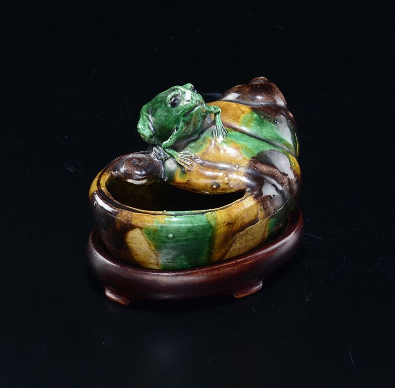 Sciacquapennelli con ranocchio su conchiglia in porcellana a smalto Sancai, Cina, Dinastia Qing, XVIII-XIX secolo