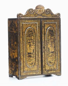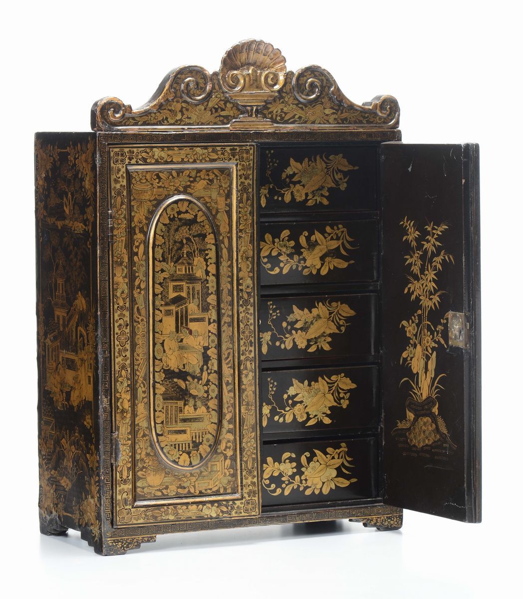 Stipo in legno laccato a due ante con decoro dorato floreale e naturalistico, Cina, Dinastia Qing, inizio XIX secolo