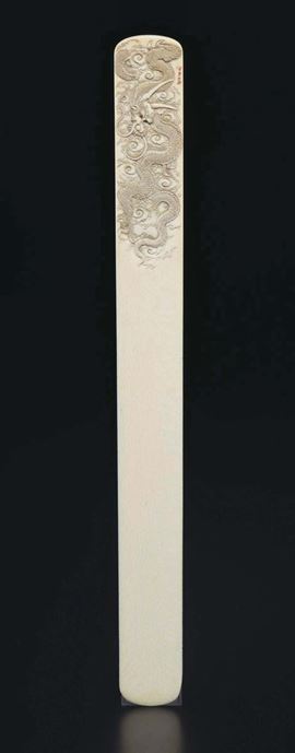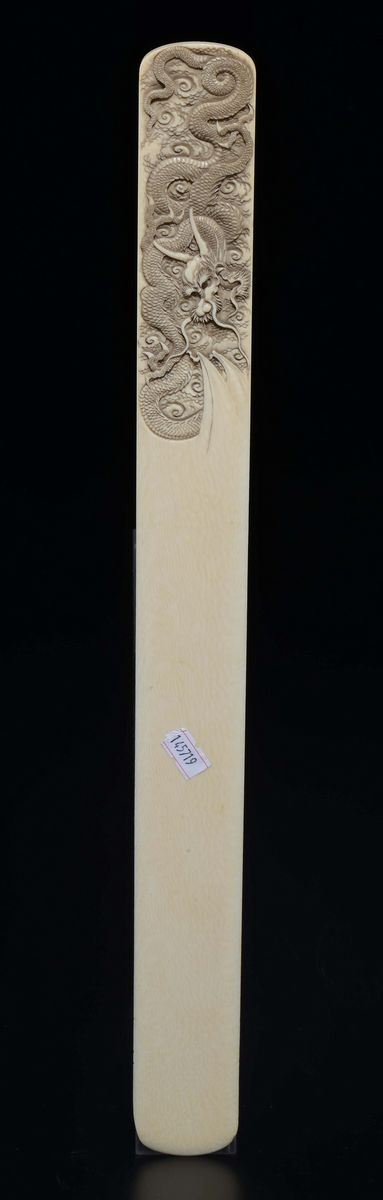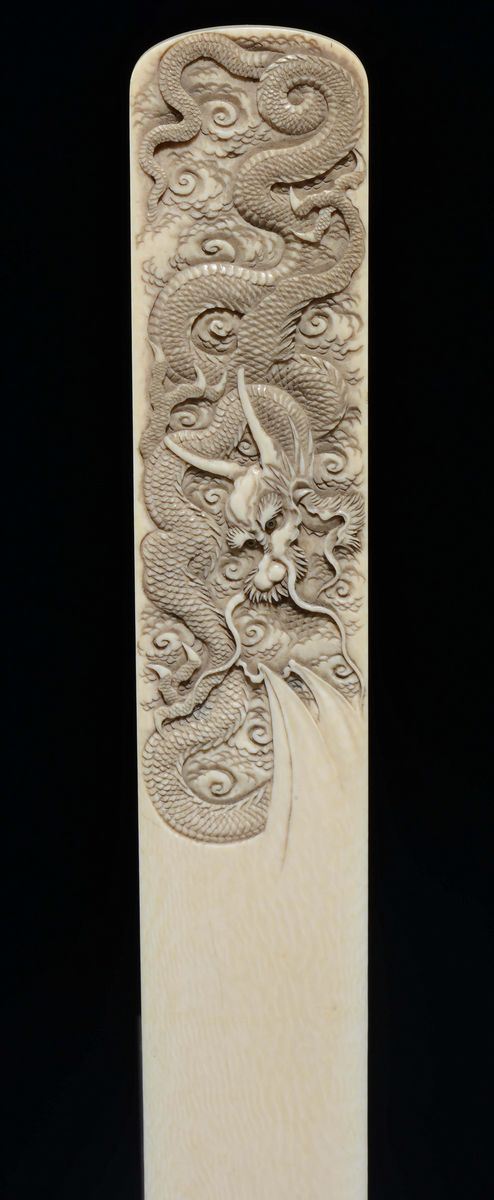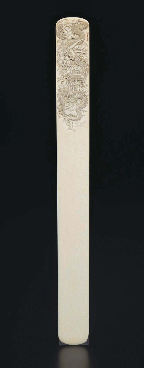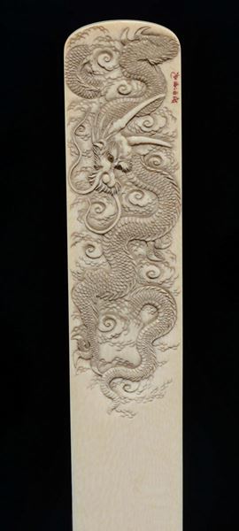 Tagliacarte in avorio con immagine di drago ed iscrizione, Cina, inizio XX secolo