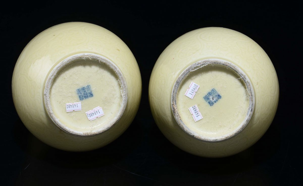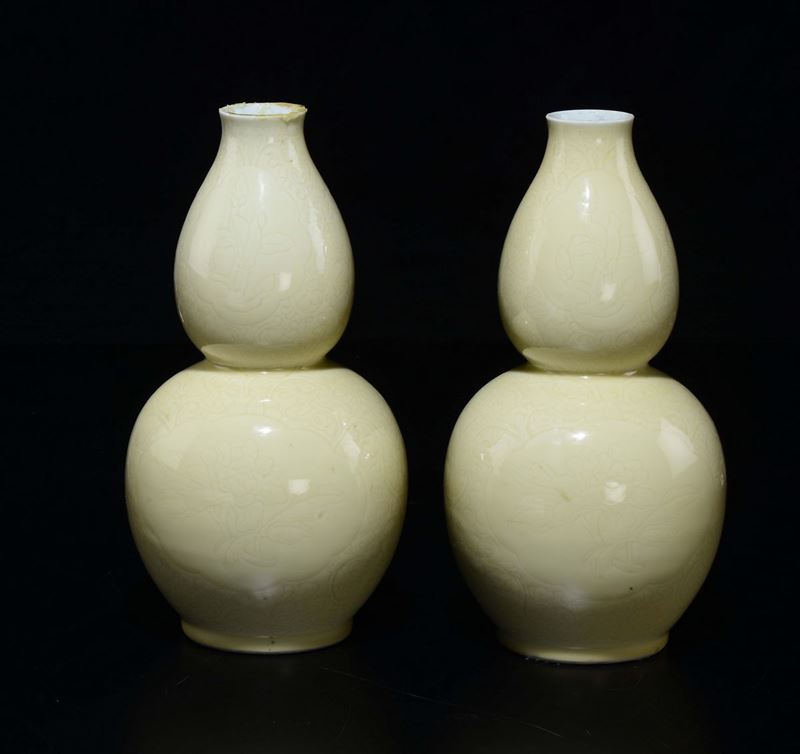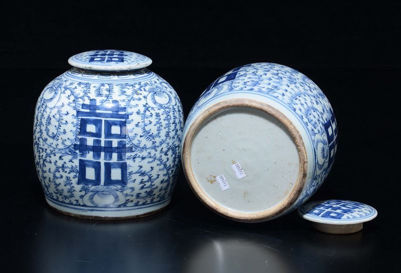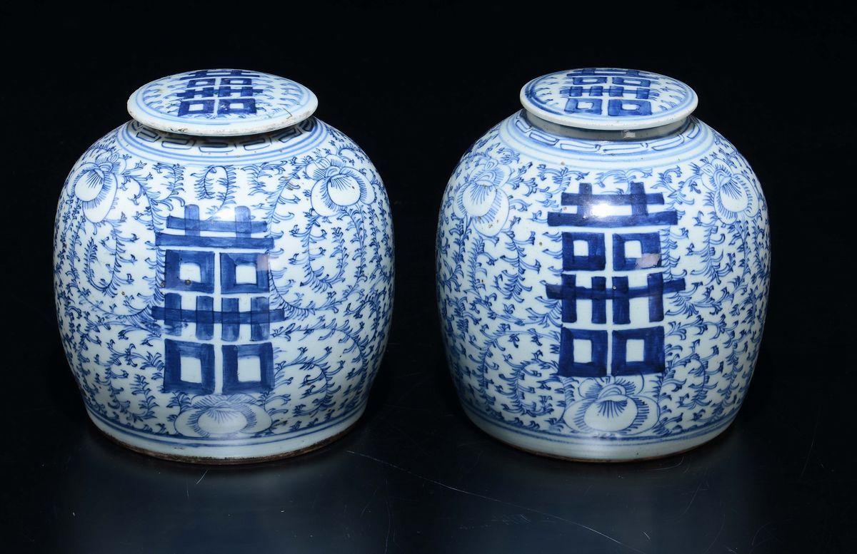 Una coppia di potiche in porcellana bianca e blu ed una coppia di vasi monocromi a doppia zucca, Cina, XX secolo