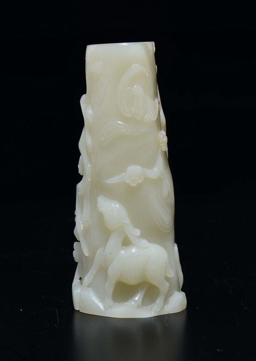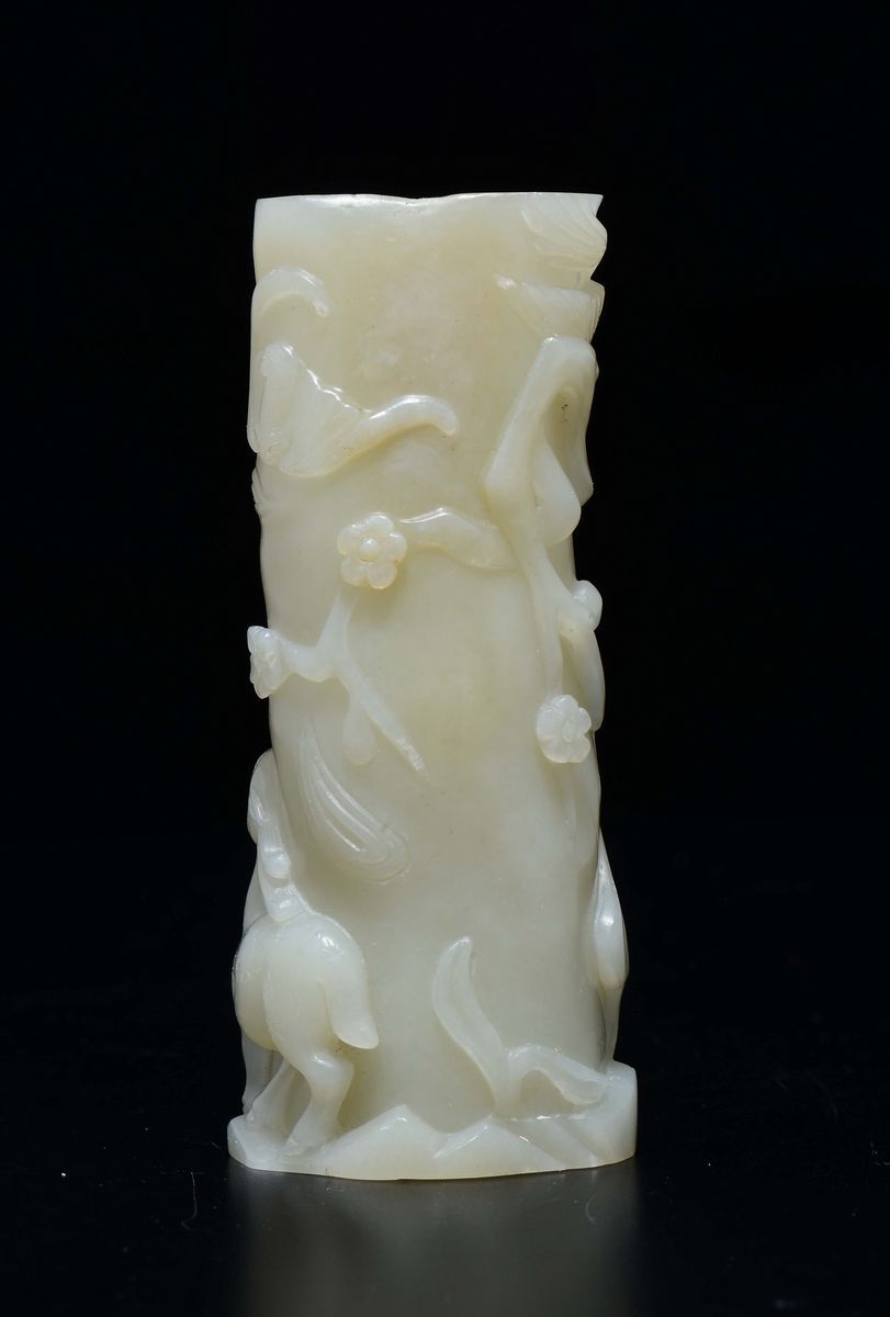 Vasetto scolpito in giada bianca con decoro a rilievo di cerbiatto e fiori, Cina, XX secolo