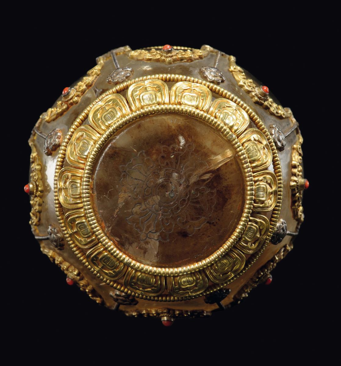 Vaso da preghiera in cristallo di rocca fumé e bronzo dorato con innesti di pietre dure, Tibet, fine XIX secolo