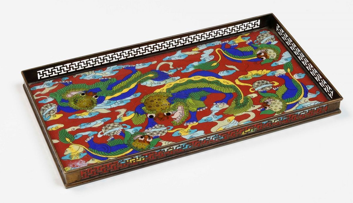 Vassoio in metallo smaltato con decoro di draghi, Cina, XX secolo