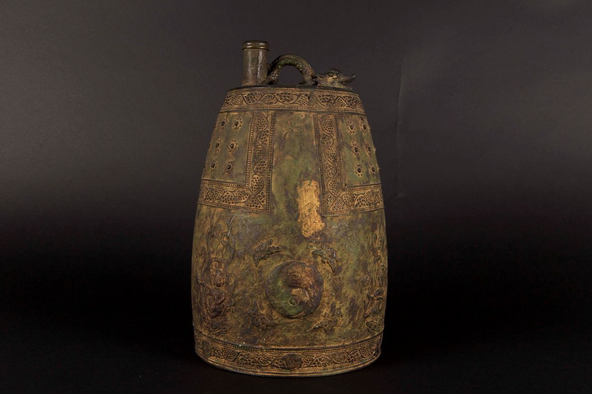 Campana con decoro d'ispirazione arcaica in bronzo con manico a guisa di drago, Cina, Dinastia Ming, XVI secolo