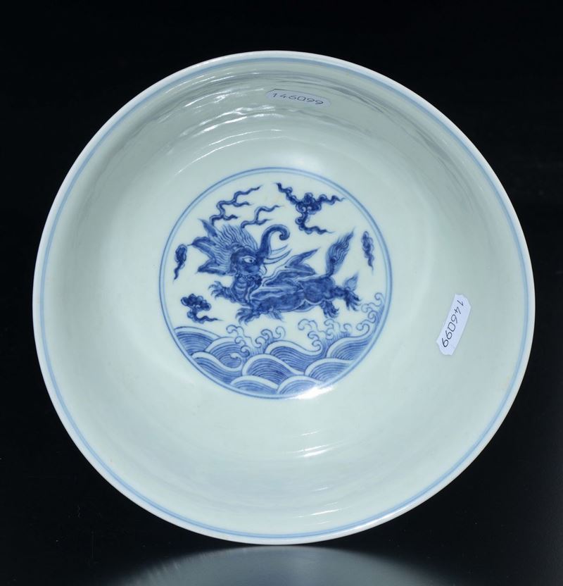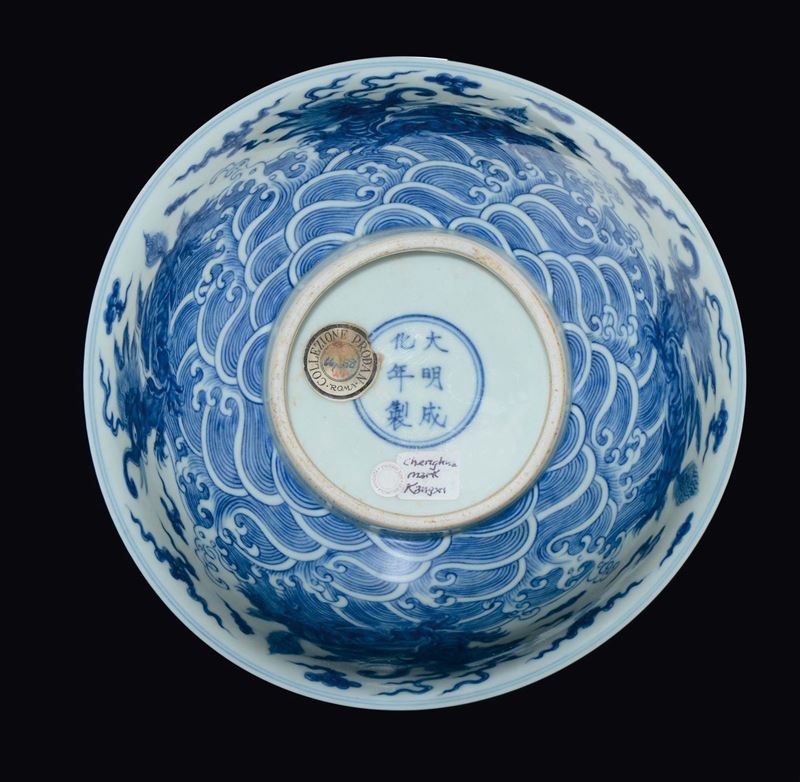 Ciotola in porcellana bianca e blu con draghi, Cina, Dinastia Qing, epoca Kangxi (1662-1722)